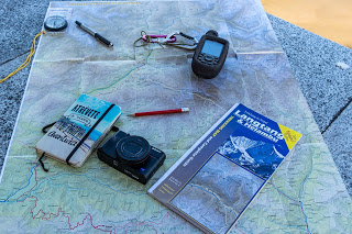 Cuaderno y bolígrafo para anotaciones, brújula, mapa y gps para orientación y también para etiquetar las fotografías de los lugares donde están hechas para geo referenciar posteriormente .